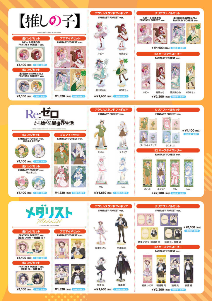 アニメ『パンどろぼう』アニメ『おでかけ子ザメ』アニメ『うごく!ねこむかしばなし』のグッズや、AnimeJapan2026 KADOKAWAブースで販売した『Re:ゼロから始める異世界生活』『【推しの子】』『メダリスト』『ようこそ実力至上主義の教室へ』など、「FANTASY FOREST」がテーマの可愛いイラストのグッズを販売します。